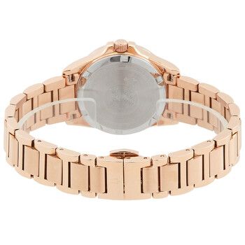 Rose gold-tone stainless steel case and bracelet. Fixed rose gold-tone bezel with diamond set. White mother of pearl dial with rose gold-tone hands and Roman numeral hour markers. Dial Type: Analog. Date display at the 3 o'clock position. Quartz movement. Scratch resistant sapphire crystal. Solid case back. Round case shape, case size: 32 mm. Band width: 16 mm. Deployant clasp. Water resistant at 100 meters / 330 feet. Functions: date, hour, minute, second. Marine Star Series. Dress watch style. Bulova Marine Star Quartz Diamond White Mother of Pearl Dial Ladies Watch 98R295.