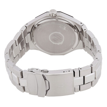 Stainless steel case with a stainless steel bracelet. Fixed stainless steel bezel with a black rim. Black dial with luminous silver-tone hands and diamond hour markers. Arabic numeral minute markers (at 5 minute intervals). Minute markers around the outer rim. Dial Type: Analog. Luminescent hands. Date display at the 3 o'clock position. Quartz movement. Scratch resistant mineral crystal. Solid case back. Round case shape. Case size: 44 mm. Case thickness: 10.4 mm. Band width: 24 mm. Band length: 9 inches. Fold over clasp with a double push button release. Water resistant at 100 meters / 330 feet. Functions: date, hour, minute, second. Additional Info: date. Sport-marine Star Series. Dress watch style. Bulova Men's Marine Star Diamond Accented Stainless Steel Bracelet Watch 98D103.