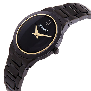Black stainless steel case and bracelet. Fixed black stainless steel bezel. Black dial with gold-tone hands. Dial Type: Analog. Bulova Calibre 9T22 automatic movement. Scratch resistant sapphire crystal. Solid case back. Round case shape, case size: 32 mm, case thickness: 9 mm. Deployment with push button release clasp. Water resistant at 30 meters / 100 feet. Functions: hour, minute. Millennia Series. Sport watch style. Bulova Millennia Automatic Black Dial Ladies Watch 98L314.