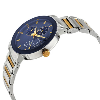 Silver-tone stainless steel case with a two-tone (silver-tone and yellow gold-tone) stainless steel bracelet. Fixed blue PVD bezel. Blue dial with yellow gold-tone hands and index hour markers. Dial Type: Analog. Luminescent hands. Three displays showing: day of the week, date, and 24 hour. Quartz movement. Scratch resistant mineral crystal. Pull / push crown. Solid case back. Round case shape. Case size: 40 mm. Case thickness: 11.2 mm. Band width: 22 mm. Deployment clasp. Water resistant at 30 meters / 100 feet. Functions: multifunction: date, day, hour, minute, second. Casual watch style. Bulova Modern Blue Dial Men's Watch 98C123.