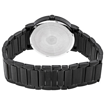 Black ion-plated stainless steel case with a black ion-plated stainless steel bracelet. Fixed black ion-plated bezel. Black dial with luminous silver-tone hands and index hour markers. Diamonds mark the 3, 6 and 9 o'clock positions. Dial Type: Analog. Luminescent hands. Date display at the 3 o'clock position. Quartz movement. Scratch resistant mineral crystal. Screw locked crown. Solid case back. Round case shape. Case size: 42 mm. Case thickness: 8.4 mm. Band width: 22 mm. Hidden fold over clasp. Water resistant at 30 meters / 100 feet. Functions: date, hour, minute, second. Additional Info: in general, withstands splashes or brief immersion in water, but not suitable for swimming or bathing. Dress watch style. Bulova Modern Diamond Black Dial Men's Watch 98D144.