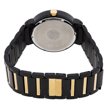 Black stainless steel case with a two-tone (black and gold-tone) stainless steel bracelet. Fixed black stainless steel bezel. Black dial with gold-tone hands and index hour markers. Dial Type: Analog. Luminescent hands. Three sub-dials displaying: day, date and 24 hour. Quartz movement. Scratch resistant mineral crystal. Pull / push crown. Solid case back. Round case shape, case size: 40 mm. Fold over clasp with a safety release. Water resistant at 30 meters / 100 feet. Functions: date, day, hour, minute, second. Modern Series. Dress watch style. Bulova Modern Quartz Black Dial Men's Watch 98C149.