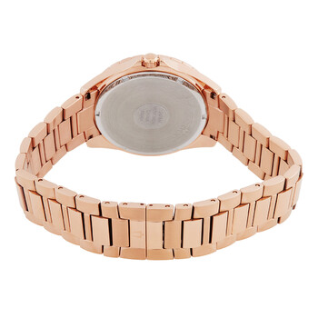 Rose gold-tone stainless steel case and bracelet. Fixed rose gold-tone bezel with crystal set. Black dial with rose gold-tone hands and crystal hour markers. Minute markers around the outer rim. Dial Type: Analog. Bulova Calibre GL34 quartz movement. Scratch resistant mineral crystal. Pull / push crown. Solid case back. Round case shape, case size: 40 mm. Band width: 20 mm. Deployant clasp. Water resistant at 30 meters / 100 feet. Functions: hour, minute, second. Phantom Series. Dress watch style. Bulova Phantom Quartz Crystal Black Dial Unisex Watch 97A180.