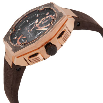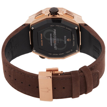 Rose gold-tone stainless steel case with a brown leather strap. Fixed rose gold-tone bezel with a grey damascus steel inlay. Black dial with luminous rose gold-tone hands and index hour markers. Minute markers around the outer rim. Dial Type: Analog. Luminescent hands and markers. Date display between the 4 and 5 o'clock positions. Quartz movement. Scratch resistant sapphire crystal. Solid case back. Round case shape. Case size: 44.5 mm. Case thickness: 17.55 mm. Band width: 22 mm. Deployant clasp. Water resistant at 50 meters / 165 feet. Functions: chronograph, date, hour, minute, second. Precisionist Series. Casual watch style. Bulova Precisionist Chronograph Quartz Black Dial Men's Watch 98B356.