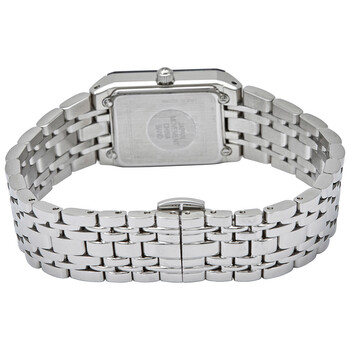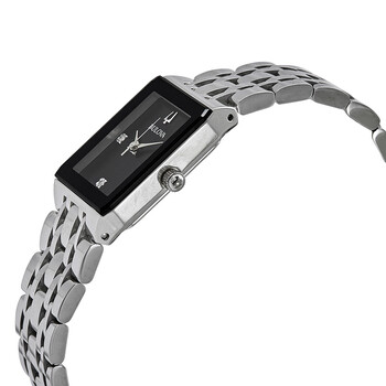 Stainless steel case with a stainless steel bracelet. Fixed stainless steel bezel with a black faceted mineral top ring. Black dial with silver-tone hands. Diamonds set at the 3, 6 and 9 o'clock positions. Dial Type: Analog. Quartz movement. Scratch resistant mineral crystal. Pull / push crown. Solid case back. Square case shape. Case dimensions: 20.5 mm x 32 mm. Case thickness: 7.1 mm. Band width: 10 mm. Fold over clasp with a push button release. Water resistant at 30 meters / 100 feet. Functions: hour, minute, second. Dress watch style. Bulova Quadra Diamond Black Dial Ladies Watch 96P202.