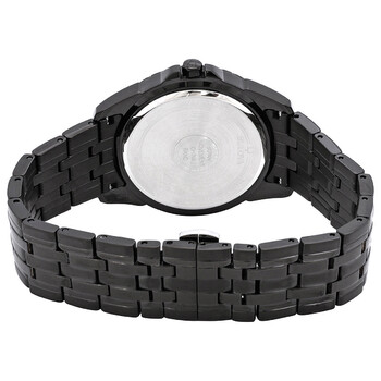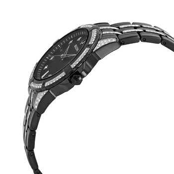 348Black PVD stainless steel set with crystals case. Black dial with silver-tone hands and crystal-index hour markers. Minute markers around the outer rim. Dial Type: Analog. Miyota Caliber 2036 quartz movement. Scratch resistant mineral crystal. Solid case back. Round case shape, case size: 42 mm, case thickness: 10.5 mm. Deployment with push button release clasp. Water resistant at 50 meters / 165 feet. Functions: hour, minute, second. Dress watch style. Watch label: Japan Movt. Bulova Quartz Crystal Black Dial Men's Watch 98K109.