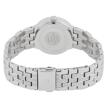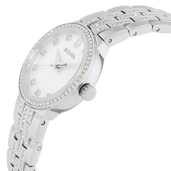 Silver-tone stainless steel case with a silver-tone stainless steel bracelet set with crystals. Fixed silver-tone bezel with crystal set. White mother of pearl dial with silver-tone hands and crystal hour markers. Dial Type: Analog. Quartz movement. Scratch resistant mineral crystal. Pull / push crown. Solid case back. Round case shape, case size: 28.5 mm, case thickness: 8.3 mm. Band width: 16 mm. Fold over clasp with a safety release. Water resistant at 30 meters / 100 feet. Functions: hour, minute. Dress watch style. Bulova Quartz Crystal White Mother of Pearl Dial Ladies Watch and Necklace Set 96X163.
