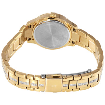 Gold-tone stainless steel case with a gold-tone stainless steel bracelet set with Swarovski crystals. Fixed gold-tone bezel set with Swarovski crystals. Mother of pearl dial with gold-tone hands and diamond hour markers. Dial Type: Analog. Small seconds sub-dial. Quartz movement. Scratch resistant mineral crystal. Pull / push crown. Solid case back. Round case shape. Case size: 30.5 mm. Band width: 12 mm. Fold over clasp with a push button release. Water resistant at 30 meters / 100 feet. Functions: hour, minute, second. Additional Info: dial embellished with 174 Swarovski crystals. Dress watch style. Bulova Quartz Diamond Crystal Mother of Pearl Dial Ladies Watch 98L283.