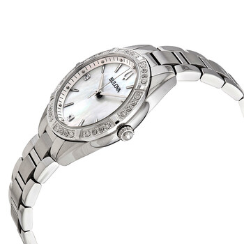 Stainless steel case with a stainless steel bracelet. Fixed stainless steel bezel set with diamonds. Mother of pearl dial with silver-tone hands and index hour markers. Diamonds mark the 3, 6 and 9 o'clock positions. Minute markers around the outer rim. Dial Type: Analog. Quartz movement. Scratch resistant sapphire crystal. Pull / push crown. Solid case back. Round case shape. Case size: 32 mm. Case thickness: 8.4 mm. Band width: 16 mm. Deployment clasp with a push button release. Water resistant at 30 meters / 100 feet. Functions: hour, minute, second. Casual watch style. Bulova Quartz Diamond Mother of Pearl Dial Ladies Watch 96R228.