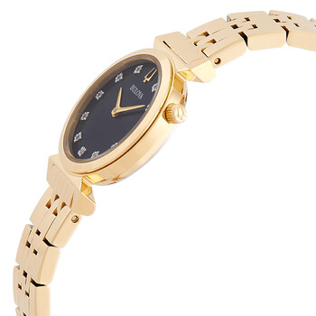 Gold-tone stainless steel case and bracelet. Fixed gold-tone stainless steel bezel. Black mother of pearl dial with gold-tone hands and diamond hour markers. Dial Type: Analog. Bulova Calibre 9T22 quartz movement. Scratch resistant sapphire crystal. Pull / push crown. Solid case back. Round case shape, case size: 24 mm, case thickness: 11 mm. Deployment with push button release clasp. Water resistant at 30 meters / 100 feet. Functions: hour, minute. Regatta Series. Dress watch style. Bulova Regatta Quartz Diamond Black Mother of Pearl Dial Ladies Watch 97P173.