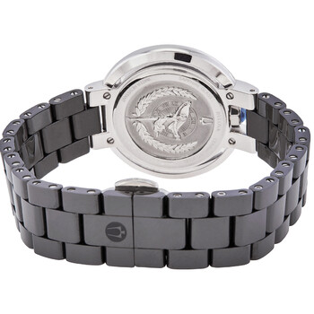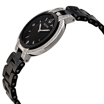 Black ceramic case with a black ceramic bracelet. Fixed black ceramic with stainless steel set with diamonds bezel. Black dial with silver-tone hands and index hour markers. Diamonds set at the 3, 6 and 9 o'clock positions. Dial Type: Analog. Quartz movement. Scratch resistant sapphire crystal. Synthetic blue spinel cabochon crown. Solid case back. Round case shape, case size: 36 mm, case thickness: 8.45 mm. Band width: 18 mm. Deployment with push button release clasp. Water resistant at 30 meters / 100 feet. Functions: hour, minute. Additional Info: synthetic blue spinel cabochon crown at the 12 o’clock position, and 73 diamonds. Casual watch style. Bulova Rubaiyat Quartz Diamond Black Dial Ladies Watch 98R266.