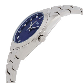Silver-tone stainless steel case and bracelet. Fixed silver-tone stainless steel bezel. Blue dial with silver-tone hands and diamond hour markers. Minute markers around the outer rim. Dial Type: Analog. Luminescent hands and markers. Miyota Caliber 2035 quartz movement. Scratch resistant mineral crystal. Pull / push crown. Solid case back. Round case shape, case size: 31 mm. Band width: 16 mm. Deployment with push button release clasp. Water resistant at 30 meters / 100 feet. Functions: hour, minute, second. Additional Info: three-hand dial hand set with 11 diamonds. Surveyor Series. Dress watch style. Watch label: Japan Movt. Bulova Surveyor Quartz Diamond Blue Dial Ladies Watch 96P229.