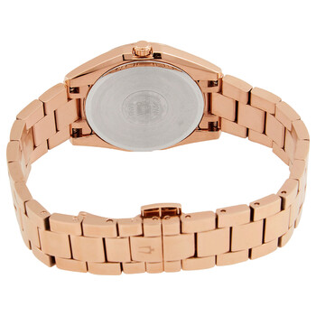 Rose gold-tone stainless steel case and bracelet. Fixed rose gold-tone bezel. Grey dial with luminous rose gold-tone hands and diamond hour markers. Minute markers around the outer rim. Dial Type: Analog. Luminescent hands. Quartz movement. Scratch resistant mineral crystal. Pull / push crown. Solid case back. Round case shape. Case size: 31 mm. Case thickness: 7.7 mm. Band width: 16 mm. Fold over clasp with a push button release. Water resistant at 30 meters / 100 feet. Functions: hour, minute, second. Surveyor Series. Dress watch style. Bulova Surveyor Quartz Diamond Grey Dial Ladies Watch 97P156.
