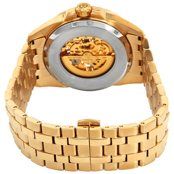 Yellow gold-tone stainless steel case and bracelet. Fixed yellow gold-tone stainless steel bezel. Gold skeleton dial with luminous black hands and Roman numeral and index hour markers. Minute markers around the outer rim. Dial Type: Analog. Luminescent hands and markers. Automatic movement. Scratch resistant mineral crystal. Pull / push crown. Transparent case back. Round case shape, case size: 43 mm, case thickness: 12.2 mm. Band width: 22 mm. Deployment clasp. Water resistant at 100 meters / 330 feet. Functions: hour, minute, second. Sutton Series. Casual watch style. Bulova Sutton Automatic Gold Skeleton Dial Men's Watch 97A162.