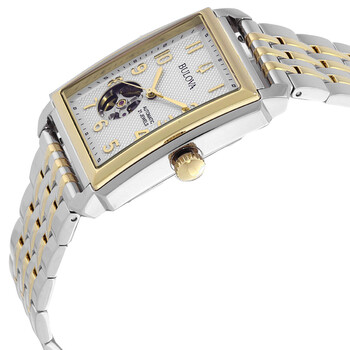 Silver-tone stainless steel case with a two-tone (silver-tone and gold-tone) stainless steel bracelet. Fixed gold-tone stainless steel bezel. Silver-tone dial with gold-tone hands and Arabic numeral hour markers. Minute markers around the outer rim. Dial Type: Analog. Bulova Calibre 82S0 automatic movement. Scratch resistant mineral crystal. Pull / push crown. Transparent case back. Rectangle case shape, case size: 33 mm. Band width: 22 mm. Deployment with push button release clasp. Water resistant at 30 meters / 100 feet. Functions: hour, minute, second. Sutton Series. Dress watch style. Bulova Sutton Automatic Silver Dial Two-Tone Men's Watch 98A308.