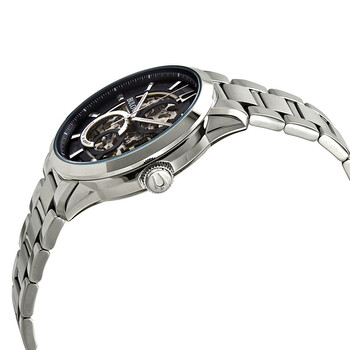 Stainless steel case with a stainless steel bracelet. Fixed stainless steel bezel. Black (skeleton center) dial with luminous silver-tone hands and index hour markers. Minute markers around the outer rim. Dial Type: Analog. Luminescent hands and markers. Automatic movement. Scratch resistant mineral crystal. Transparent case back. Round case shape. Case size: 43 mm. Case thickness: 12.15 mm. Band width: 21 mm. Deployment clasp with a push button release. Water resistant at 30 meters / 100 feet. Functions: hour, minute, second. Dress watch style. Bulova Sutton Automatic Skeleton Dial Men's Watch 96A208.