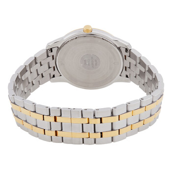 Silver-tone stainless steel case with a two-tone (silver-tone and gold-tone) stainless steel bracelet. Fixed gold-tone stainless steel bezel. Silver dial with gold-tone hands and index hour markers. Minute markers around the outer rim. Dial Type: Analog. Date display at the 6 o'clock position. Quartz movement. Scratch resistant mineral crystal. Pull / push crown. Solid case back. Round case shape, case size: 40 mm. Fold over clasp with a safety release. Water resistant at 30 meters / 100 feet. Functions: date, hour, minute, second. Sutton Series. Casual watch style. Bulova Sutton Quartz Silver Dial Men's Watch 98B385.