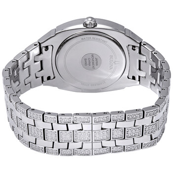 Stainless steel case with a stainless steel bracelet with crystal pave links. Fixed stainless steel bezel set with crystal pavel. Crystal pave dial with luminous silver-tone hands and index hour markers. Dial Type: Analog. Luminescent hands. Date display at the 6 o'clock position. Quartz movement. Scratch resistant mineral crystal. Pull / push crown. Solid case back. Cushion case shape. Case size: 40 mm. Case thickness: 11.1 mm. Band width: 20 mm. Band length: 7 inches. Fold over clasp. Water resistant at 30 meters / 100 feet. Functions: date, hour, minute, second. Additional Info: watch set with 582 swarovski crystals. Dress watch style. Bulova Swarovski Crystal Pave Men's Watch 96B296.