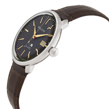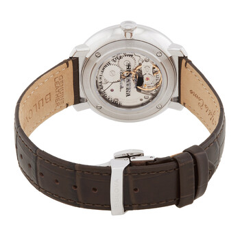 Silver-tone stainless steel case with a brown leather strap. Fixed silver-tone stainless steel bezel. Gray dial with gold-tone hands and index hour markers. Minute markers around the outer rim. Dial Type: Analog. Date display at the 3 o'clock position. Hand wind movement. Scratch resistant sapphire crystal. Pull / push crown. Transparent see through case back. Round case shape, case size: 40 mm, case thickness: 9.45 mm. Deployment with push button release clasp. Water resistant at 30 meters / 100 feet. Functions: hour, minute, second. The Best Is Yet To Come Series. Dress watch style. Watch label: Swiss Made. Bulova The Best Is Yet to Come Hand Wind Men's Watch 96B345.