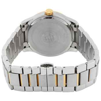 Silver-tone stainless steel case with a two-tone (silver-tone and gold-tone) stainless steel bracelet. Fixed gold-tone stainless steel bezel. Silver-tone dial with gold-tone hands and Roman numeral hour markers. Minute markers around the outer rim. Dial Type: Analog. Luminescent hands. Date display at the 3 o'clock position. Quartz movement. Scratch resistant mineral crystal. Pull / push crown. Solid case back. Round case shape, case size: 41 mm. Band width: 22 mm. Deployant clasp. Water resistant at 30 meters / 100 feet. Functions: date, hour, minute, second. Wilton Series. Dress watch style. Watch label: Japan Movt. Bulova Wilton Quartz Silver Dial Two-Tone Men's Watch 98B391.