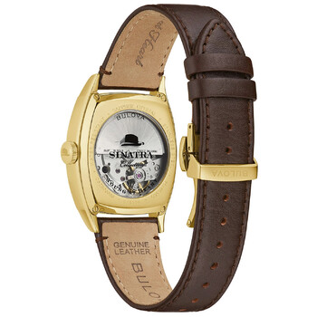 Gold-tone stainless steel case with a brown leather strap. Fixed gold-tone bezel. Whiskey sunray dial with gold-tone hands and Arabic numeral hour markers. Dial Type: Analog. Date display at the 3 o'clock position. The iconic Fedora logo appears at the 12 o'clock position. Bulova Miyota caliber 8215 automatic movement with a 42-hour power reserve. Scratch resistant sapphire crystal. Transparent case back. Tonneau case shape. Case size: 33.5 mm. Case thickness: 11.85 mm. Deployment clasp. Water resistant at 30 meters / 100 feet. Functions: date, hour, minute, second. Young At Heart Series. Casual watch style. Bulova Young at Heart Automatic Whiskey Sunray Dial Men's Watch 97B198.