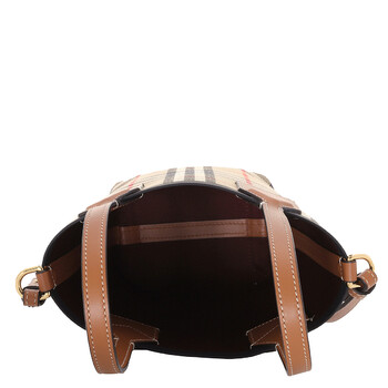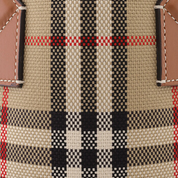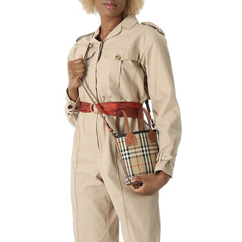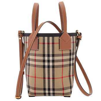 Burberry Ladies Tote. SKU: 8070461. Color: Archive Beige. Size: 5.1 x 3.4 x 7.7in. Burberry Archive Beige Vintage Check Mini London Tote Bag. This mini tote in check cotton canvas and detailed with a polished metal hardware, hand-painted edges, open top, leather top handles and a removable/adjustable shoulder strap. Min. strap drop: 20.9in. Max. strap drop: 22.8in. 54% cotton, 43% polyurethane, 3% acrylic. Made in Italy.