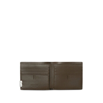 Burberry Men's Wallets. SKU: 8080664. Color: Military. Size: L:11cm x W:9.5cm. Burberry B-Cut Bi-Fold Calf Leather Wallet. This wallet is crafted from calf leather with a grained texture, featuring a silver-tone logo plaque, tonal stitching, and a bi-fold design with an open front. It has a debossed internal logo, internal card slots, and a full lining. 100% Calf Leather, 100% Lambskin Leather, 78% Cotton, 22% Polyurethane. Made in Italy.