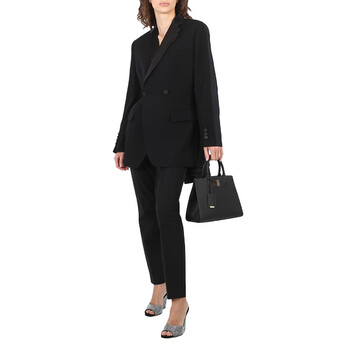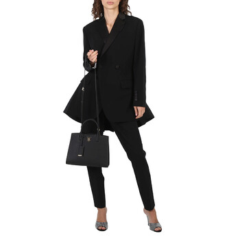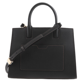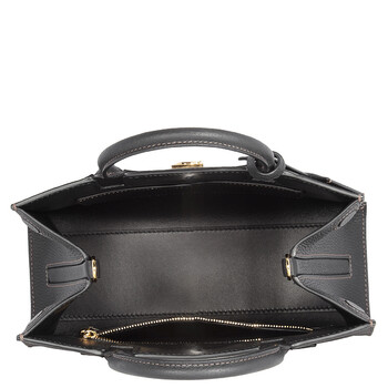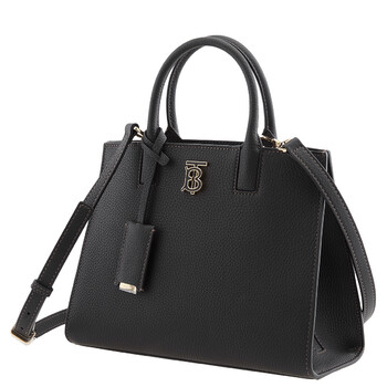 Burberry Ladies Tote. SKU: 8072511. Color: Black. Size: W 10.6" x H 7.9" x D 3.9". Burberry Black Frances TB Plaque Tote Bag. Crafted from calf leather, this bag features two top handles, adjustable detachable shoulder strap, a partitioned compartment, interior zip-fastening pocket, exterior slip pocket to the rear, and adorned with a logo plaque on the front. Made in Italy.