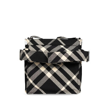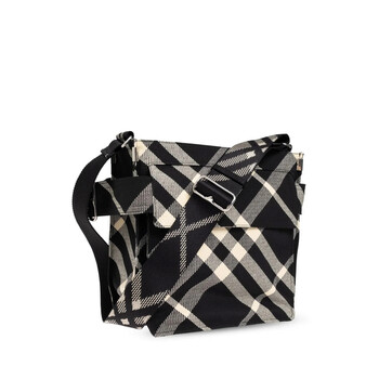 Burberry Men's Tote. SKU: 8091822. Material: Cotton;Polyester. Color: Black/Calico. Size: H:29cm x W:29cm x D:8.5cm. Burberry Checked Trench Shoulder Bag. This shoulder bag is made of canvas with silver-colored fittings, featuring a logo buckle, an adjustable shoulder strap, front flap pockets, and a major interior zip pocket. 65% Polyester, 35% Cotton. Made in Italy.