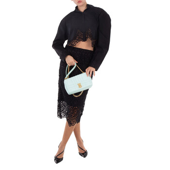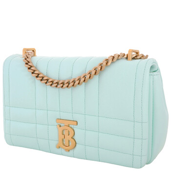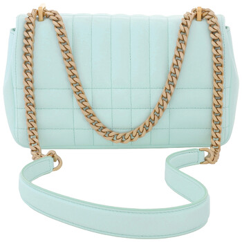 Burberry Ladies Shoulder Bag. SKU: 8070495. Color: Cool Mint. Size: 9. 1 x 2. 4 x 5. 1in. Burberry Cool Mint Quilted Small Lola Bag. The Lola bag, presented in a vibrant mint hue, is crafted from supple lambskin leather. It showcases a padded checked motif and a polished monogram at the center, embodying two of the brand's iconic signatures. The bag is equipped with a leather and chain-link shoulder strap, a foldover top secured by a magnetic fastening, an internal patch pocket, and is fully lined. Lambskin 100% Made in Italy.