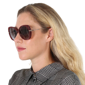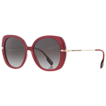 Burberry Sunglasses. Series Eugenie. Series number: BE4374. Color code: 40228G. Shape: Butterfly. Lens Width: 55 mm. Lens Bridge: 17 mm. Arm Length: 140 mm. 100% UV protection. Frame Material: Plastic. Frame Color: Bordeaux. Lenses Type: Grey Gradient. Rim Style: Full-Rim. UPC/EAN code: 8056597713115. Burberry Eugenie Grey Gradient Butterfly Ladies Sunglasses BE4374 40228G 55.