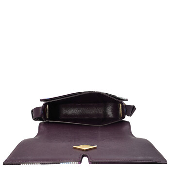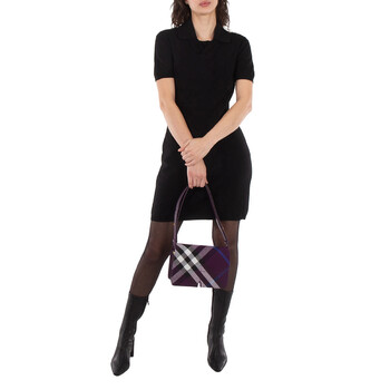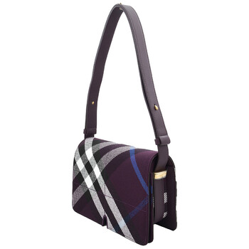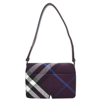Burberry Ladies Crossbody. SKU: 8092971. Barcode: 5045706904363. Color: Pansy. Size: 9.1 x 2.6 x 6.3in. Burberry Jacquard-Woven Snip Bag. Crafted from a cotton blend and jacquard-woven with the Burberry Check, this bag features an adjustable leather crossbody strap, a foldover flap with a magnetic closure, an exterior slip pocket, and an interior slip pocket. It is detailed with hand-painted edges, geometric topstitching, and finished with brushed metal hardware. 5% polyester, 35% cotton. Made in Italy.
