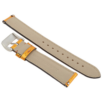 Metallic orange leather strap with "quick-change" or "quick-release," this type of strap features a spring bar with a tiny knob protruding through a slot on the underside of the strap. . Band width: 18 mm, band length: 7 inches. Tang clasp. Burberry Ladies 18 mm Metallic Orange Leather Watch Band 3897538.