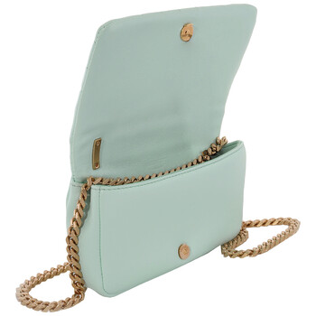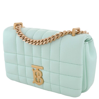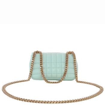 Burberry Ladies Crossbody. SKU: 8070497. Color: Cool Mint. Size: 17 x 3.5 x 10cm/6.7 x 1.4 x 3.9in. Burberry Ladies Quilted Logo Plaque Shoulder Bag. This shoulder bag features a quilted design, a signature TB monogram plaque, gold-tone hardware, a front flap closure, an internal slip pocket, an adjustable chain-link shoulder strap and a concealed magnetic fastening. 100% Lambskin Leather. Made in Italy.