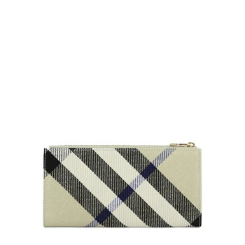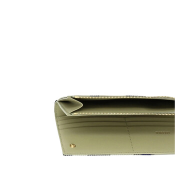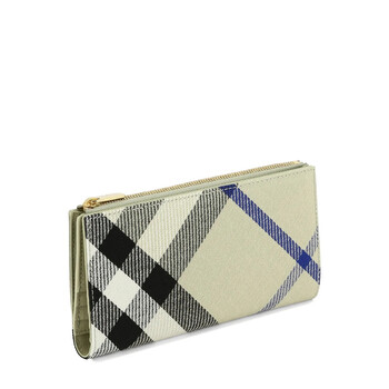 Burberry Ladies Wallets. SKU: 8085975. Barcode: 5045705630164. Color: Lichen. Size: W:19cm x H:9cm x D:1cm. Burberry Large Checked Bi-Fold Wallet. This bi-fold wallet features a classic check pattern and a side zip-fastening pocket. It has a press-stud closure, internal card slots, and a debossed logo inside. The wallet is finished with leather lining for a premium touch. Polyurethane 65%, Cotton 35% Made in Italy.