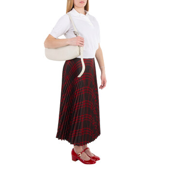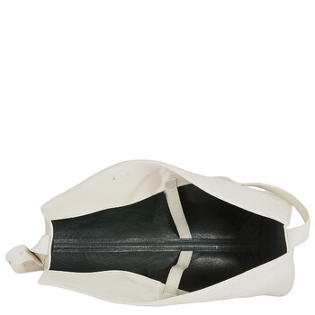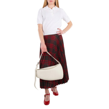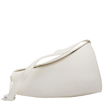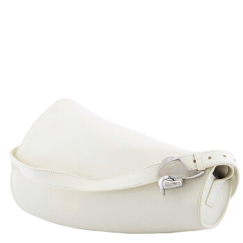 Burberry Ladies Shoulder Bag. SKU: 8086480. Barcode: 5045705881740. Color: Almond. Size: 13.2 x 6.3 x 7.9in. Burberry Large Leather Horn Bag in Almond. This shoulder bag is crafted from grainy leather with an embossed check lining. Its conical shape curves to fit the body and features a brushed metal Knight buckle for adjustable strap length. Embellished with the signature Equestrian Knight motif, the bag also includes a foldover top with a magnetic fastening and a spacious main compartment. The adjustable shoulder strap ensures comfort, and it is proudly made in Italy.