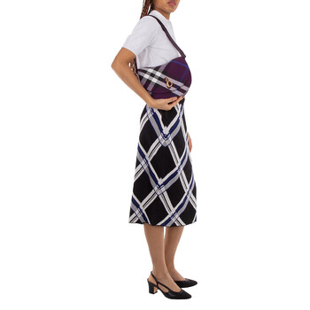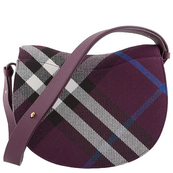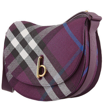 Burberry Ladies Shoulder Bag. SKU: 8093062. Barcode: 5045706795978. Color: Pansy. Size: 26 x 9.5 x 20.5cm/10.2 x 3.7 x 8.1in. Burberry Medium Rocking Horse Bag. Crafted from a cotton blend jacquard-woven with the Burberry Check, this bag features an adjustable leather strap, a foldover flap with 'B' closure, and two interior slip pockets. It also includes an exterior slip pocket with magnetic closure, hand-painted edges, a curved shape, and is finished with brushed metal hardware. 65% polyester, 35% cotton. Made in Italy.