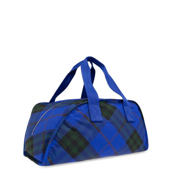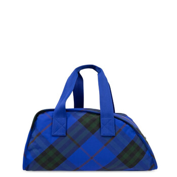 Burberry Men's Duffle Bag. SKU: 8080680. Color: Knight. Size: W:51cm x H:27cm x D:26.5cm. Burberry Medium Shield Check Pattern Duffle Bag. This duffle bag features a Nova Check pattern, an asymmetric body, two top handles, and a top zip fastening. Outer: Polyamide 100%, Calf Leather 100%, Lining: Polyamide 100%.