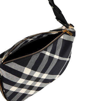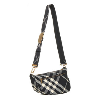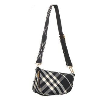 Burberry Ladies Crossbody. SKU: 8087625. Material: Cotton;Polyester. Color: Black/Calico. Size: W:32cm x H:16cm x D:15cm. Burberry Medium Shield Check Printed Shoulder Bag. This shoulder bag features a vintage check pattern, a zippered pocket on the side, a back pocket with a zipper, an adjustable shoulder strap, a major patch inside the pocket, gold-colored fittings, and a top zipper closure. 65% Polyester, 35% Cotton. Made in Italy.
