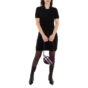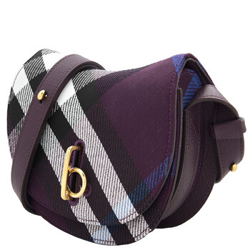 Burberry Ladies Crossbody. SKU: 8095061. Barcode: 5045707314468. Color: Pansy. Size: 7.5 x 2.4 x 6.3in. Burberry Mini Rocking Horse Bag. Crafted from a cotton blend and jacquard-woven with the Burberry Check, this bag features an adjustable leather strap, a foldover flap with a ‘B’ closure, hand-painted edges, and a leather lining. Its curved shape and structured silhouette are finished with a ‘B’ closure at the flap. 65% polyester, 35% cotton.