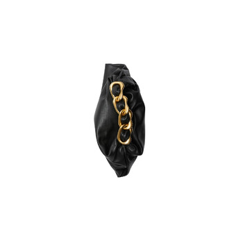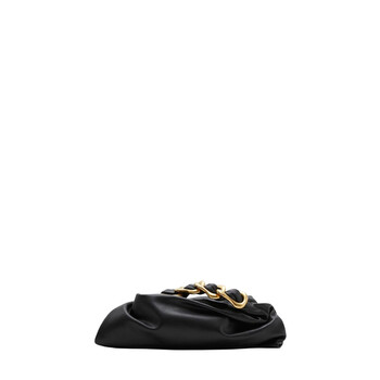 Burberry Ladies Shoulder Bag. SKU: 8090990. Color: Black. Size: 12.6 x 3.5 x 5.5in. Burberry Mini Swan Leather Bag. This Italian-made shoulder bag is crafted from a single piece of smooth calf leather, featuring a softly structured shape, a chain-link strap interwoven with leather, a zip closure, an interior zip pocket, hand-painted edges, brushed metal hardware, and a subtle embossed Equestrian Knight Design at the front. Outer: 100% calf leather. Made in Italy.