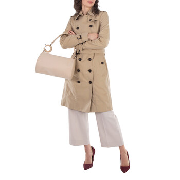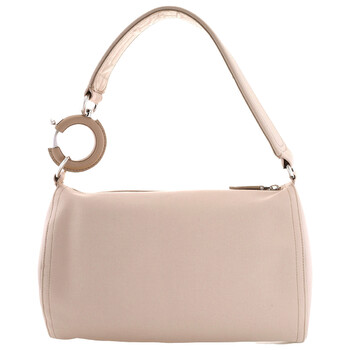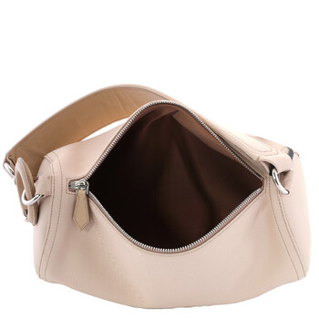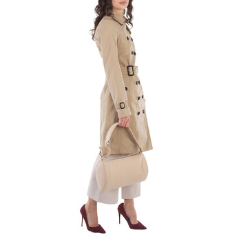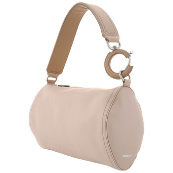 Burberry Ladies Shoulder Bag. SKU: 8053350. Color: Soft Fawn. Size: H19cm x W31cm. Burberry Rhombi Small Shoulder Bag. Crafted from cotton canvas, this shoulder bag features a silver-tone logo print, a decorative shoulder strap with a round snap hook, silver-tone metal hardware, and one internal compartment with a slip pocket. Material: 100% Cotton. Made in Italy.