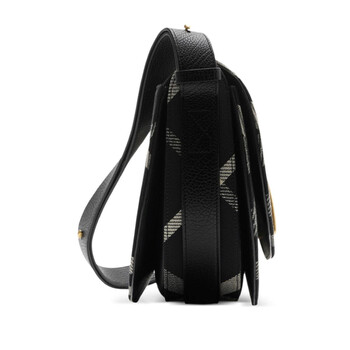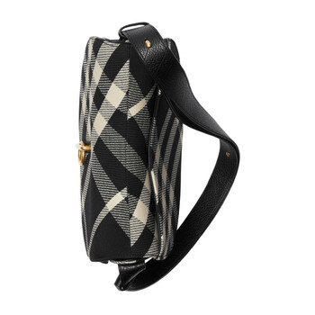 Burberry Ladies Shoulder Bag. SKU: 8093063. Barcode: 5045706796005. Color: Black. Burberry Rocking Horse Checked Crossbody Bag. The Rocking Horse crossbody bag is crafted from a calf leather blend and features a Nova check pattern. It includes a gold-tone logo plaque, an adjustable shoulder strap, and a slip pocket at the rear. The bag has a foldover top and a spacious main compartment for convenience. Calf Leather 100%, Polyester 65%, Cotton 35% Made in Italy.