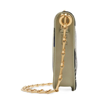 Brand: Burberry. SKU: 8086012. Color: Lichen. Size: W:21.5cm x H:11.5cm x D:3.5cm. Burberry Shield Check-Pattern Mini Bag. This bag features a check pattern, a shoulder strap with a chain, and a zipper at the top. 65% Polyester, 35% Cotton. Made in Italy.