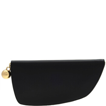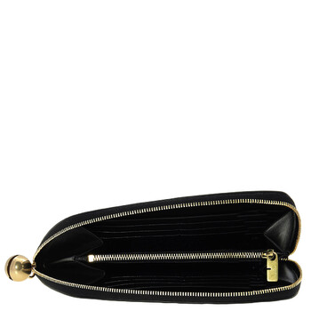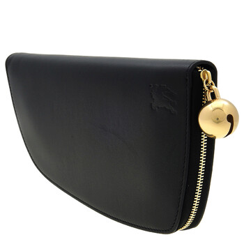 Burberry Ladies Pouch. SKU: 8079854. Color: Black. Burberry Shield Leather Wallet. The wallet features a hand-painted edge and an embossed Equestrian Knight design on the front, finished with a bell charm zip closure and an exterior card slot, along with a zip-around closure. 100% Leather, Made in Italy.