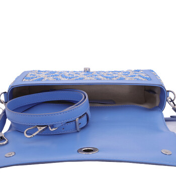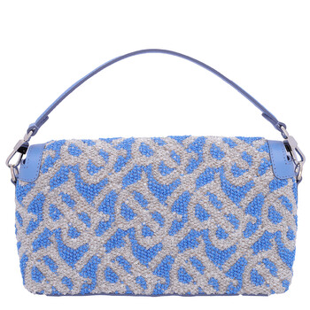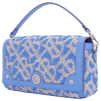 Burberry Ladies Shoulder Bag. SKU: 8066190. Color: Cool Cornflower Blue. Burberry Small Note TB Sequins Yarn Shoulder Bag In Cool Cornflower Blue. Trimmed in smooth leather, this design offers versatility with a detachable leather top handle and an adjustable crossbody strap. It features a foldover top with magnetic closure, an interior slip pocket, and hand-painted edges. Polished metal hardware adds a refined finish. Made in Italy.