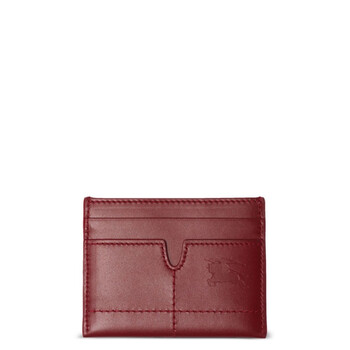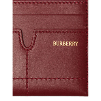 Burberry Ladies Card Case. SKU: 8093129. Material: Calfskin;Cotton. Color: Ruby. Size: W:10cm x L:7.5cm. Burberry Snip Logo Printed Leather Card Case. This card case is crafted from smooth grain calf leather, featuring card slots, a gold-tone logo lettering, a debossed logo on the front, and the signature Equestrian Knight motif. 100% Calf Leather, 53% Cotton, 47% Polyurethane. Made in Italy.