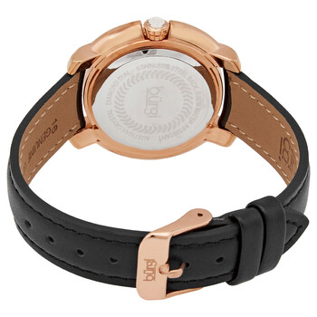 Rose gold-tone alloy case with a black leather strap. Fixed rose gold-tone alloy bezel set with black Swarovski crystals. Black mother of pearl (crystal-set) dial with rose gold-tone skeleton hands and crystal hour markers. Roman numerals appear at the 3, 6, 9 and 12 o'clock positions. Dial Type: Analog. Quartz movement. Scratch resistant mineral crystal. Pull / push crown. Solid case back. Round case shape. Case size: 37 mm. Case thickness: 8 mm. Strap width: 16 mm. Tang clasp. Water resistant at 30 meters / 100 feet. Functions: hour, minute, second. Casual watch style. Burgi Black Mother of Pearl Dial Black Leather Ladies Watch BUR156BKR.