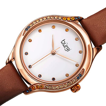 Rose gold-tone polished alloy case with a brown leather strap. Fixed rose gold-tone alloy bezel set with Swarovski crystals. White dial with rose gold-tone leaf hands and Swarovski crystal hour markers. Dial Type: Analog. Quartz movement. Scratch resistant mineral hardened coating crystal. Pull / push crown. Solid case back. Round case shape. Case size: 34 mm. Case thickness: 7.5 mm. Band width: 14 mm. Band length: 7.5 inches. Tang clasp. Water resistant at 30 meters / 100 feet. Functions: hour, minute, second. Crystal Series. Casual watch style. Burgi Crystal White Dial Brown Leather Ladies Watch BUR239BR.