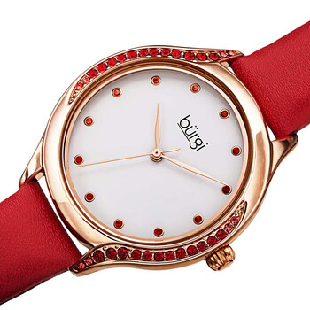 Gold-tone polished alloy case with a red leather strap. Fixed gold-tone alloy bezel set with crystals. White dial with gold-tone leaf hands and crystal hour markers. Dial Type: Analog. Quartz movement. Scratch resistant mineral crystal. Push/pull crown. Solid case back. Round case shape. Case size: 34 mm. Case thickness: 7.5 mm. Band width: 14 mm. Band length: 7.5 inches. Tang clasp. Water resistant at 30 meters / 100 feet. Functions: hour, minute, second. Crystal Series. Casual watch style. Burgi Crystal White Dial Red Leather Ladies Watch BUR239RD.